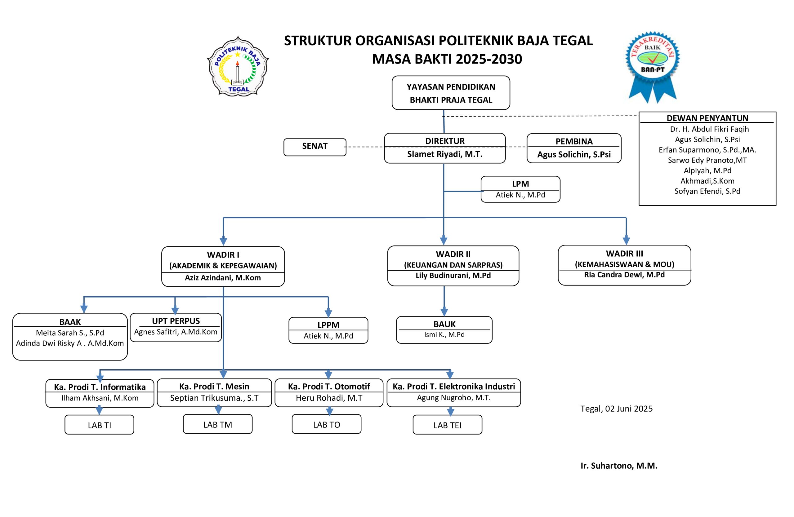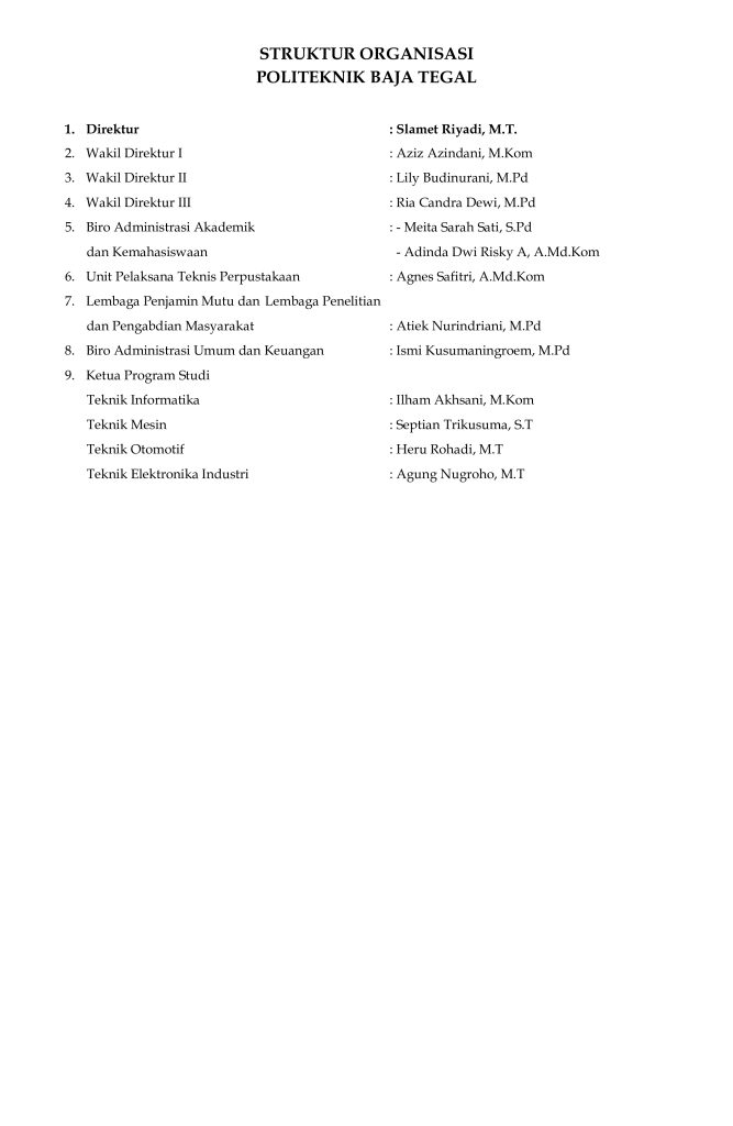 Direktur : Slamet Riyadi, S.T., M.T.Wakil Direktur 1 : Aziz Azindani, M.KomWakil Direktur 2 : Lily Budinurani, M.Pd.Wakil Direktur 3 : Ria Candra Dewi, M.Pd.
